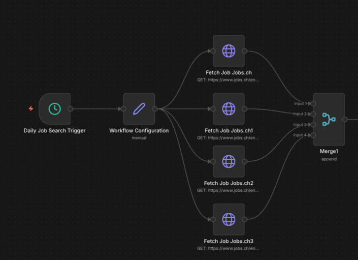 I designed and built a system that wakes up every morning and automatically scrapes Jobs.ch across multiple search categories. It merges all the results, strips out duplicates, and feeds everything into an AI that scores each job against your personal profile. Anything below 80 out of 100 gets dropped.