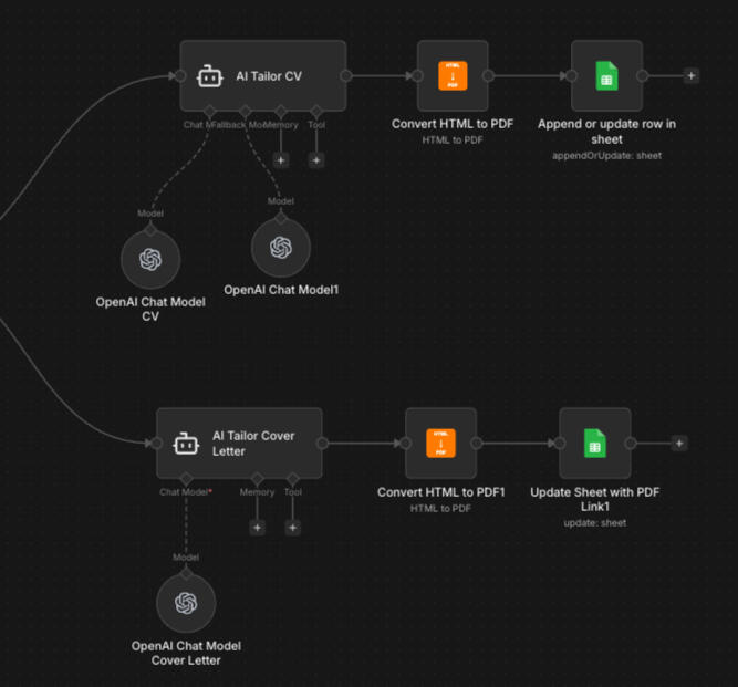 For the jobs that make the cut, the system does two things at once: it generates a personalized cover letter for that specific role, and it tailors your CV to match it, using your existing CV as the base template. Both get converted to PDF automatically. Everything then gets logged into a Google Sheet with the job details and the AI's reasoning for why it's a good match.