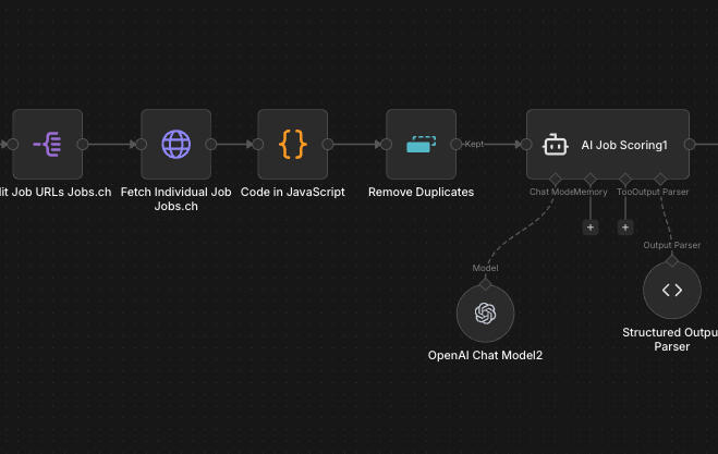 I designed and built a system that wakes up every morning and automatically scrapes Jobs.ch across multiple search categories. It merges all the results, strips out duplicates, and feeds everything into an AI that scores each job against your personal profile. Anything below 80 out of 100 gets dropped.